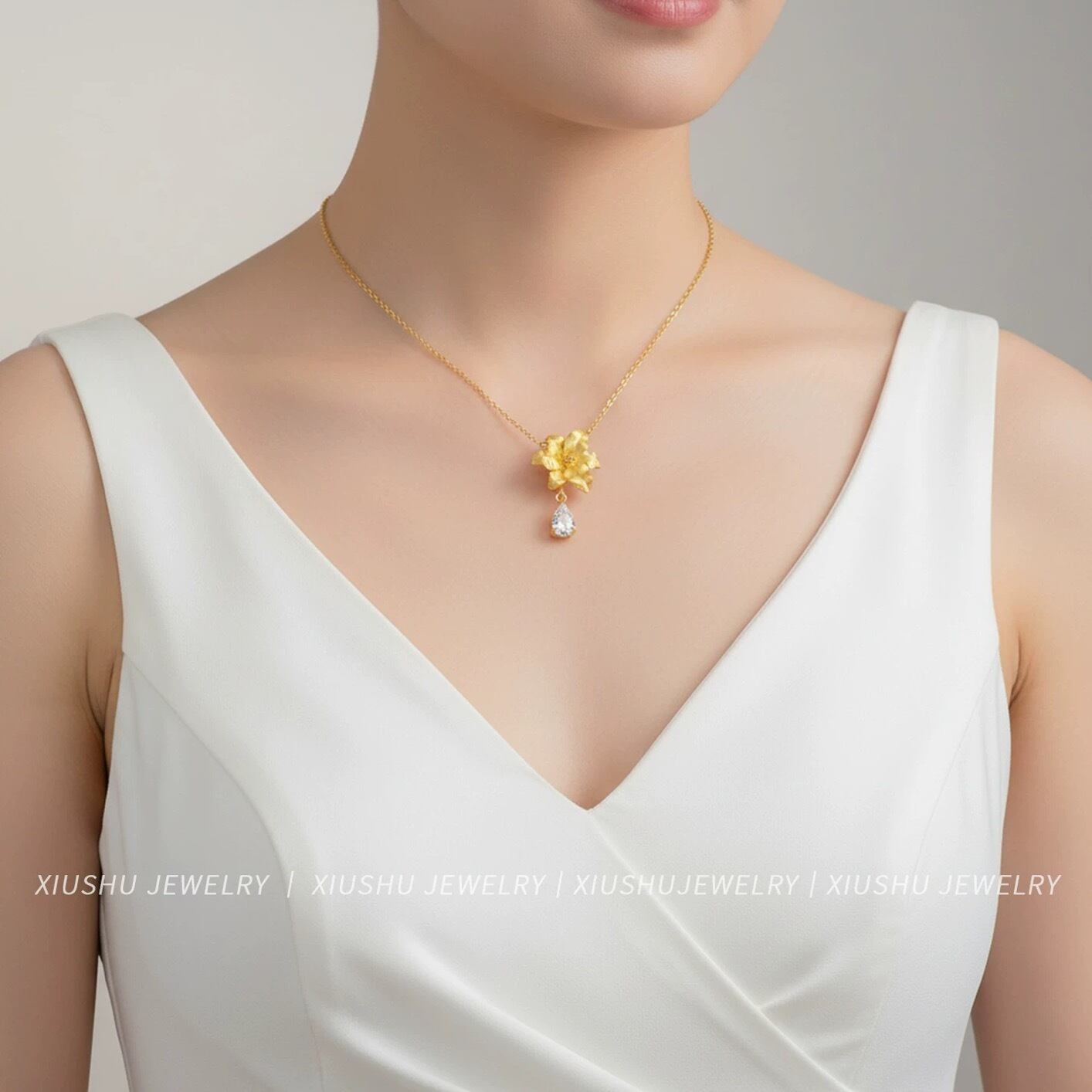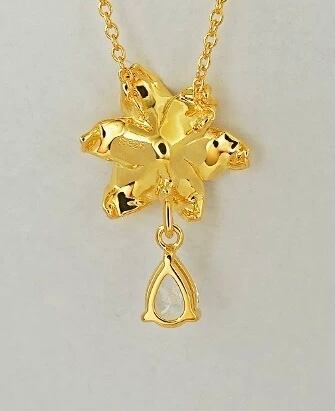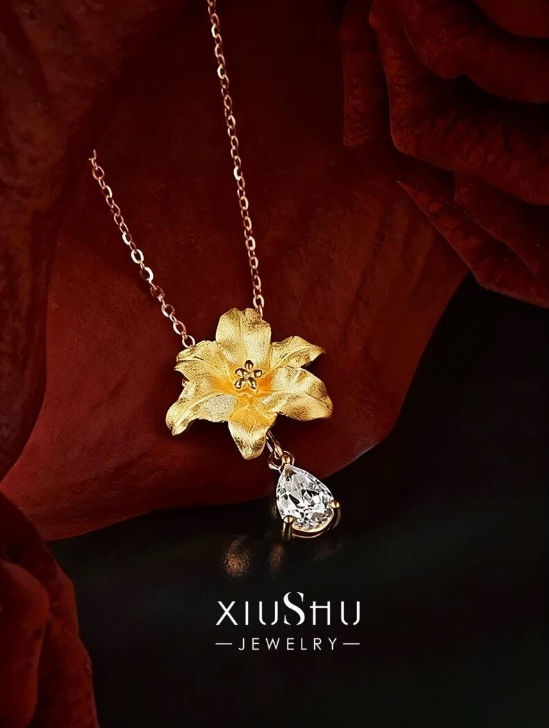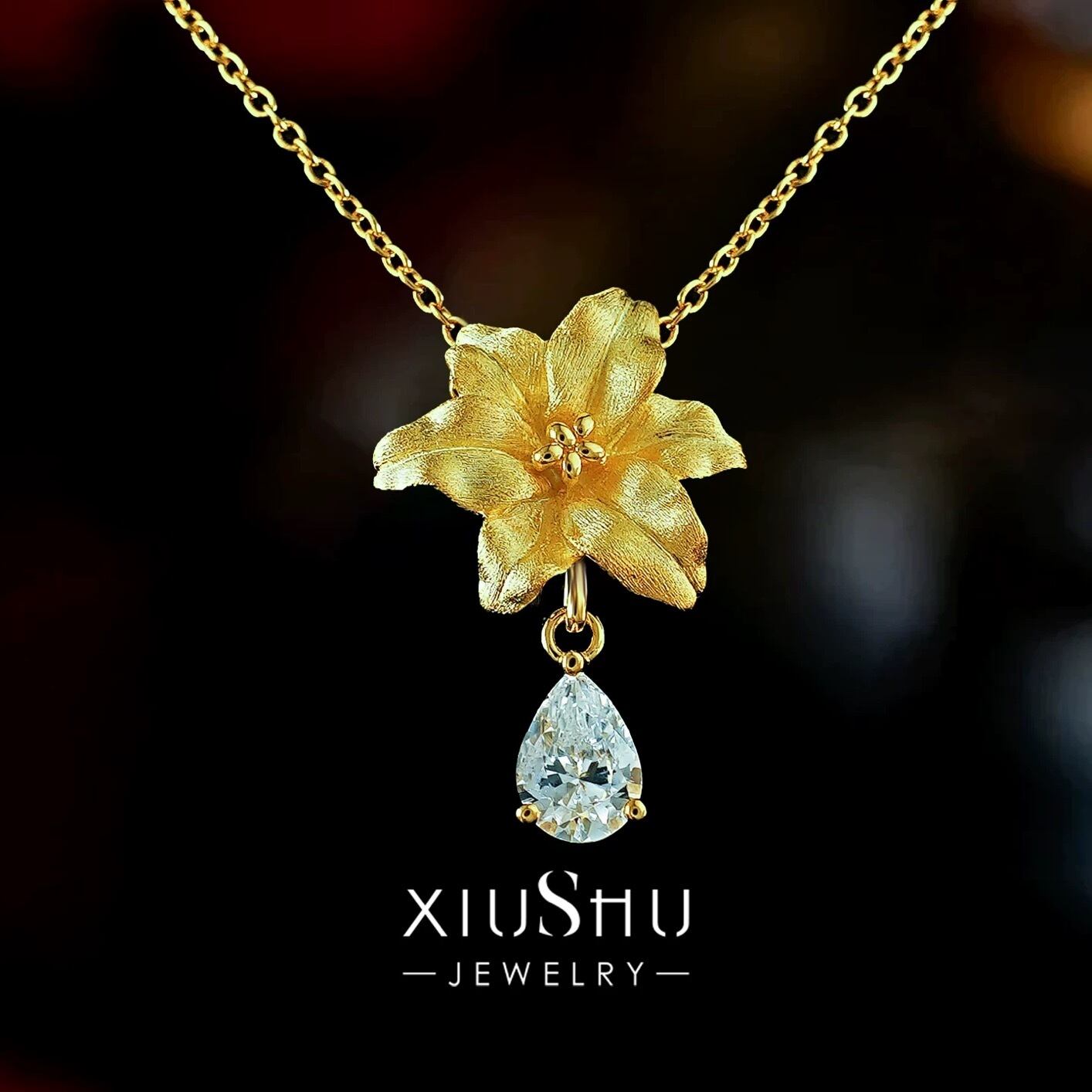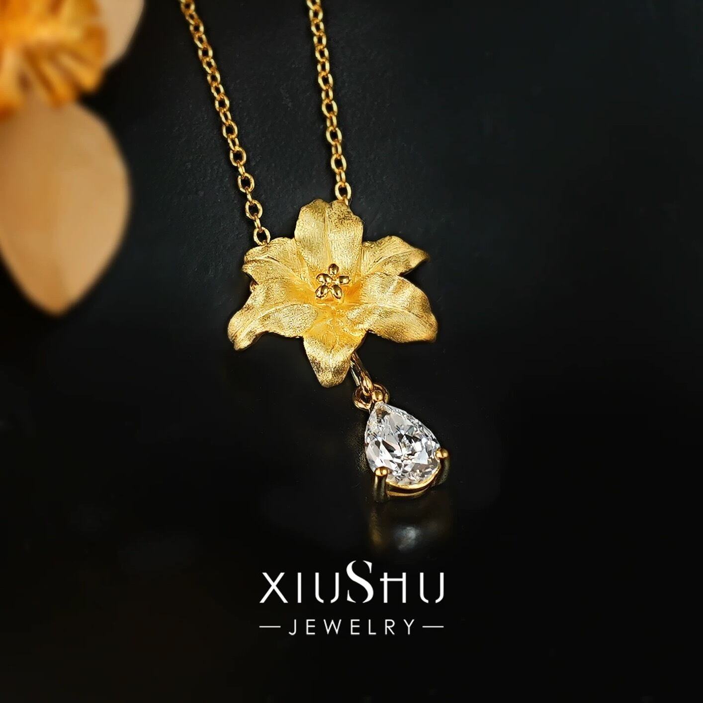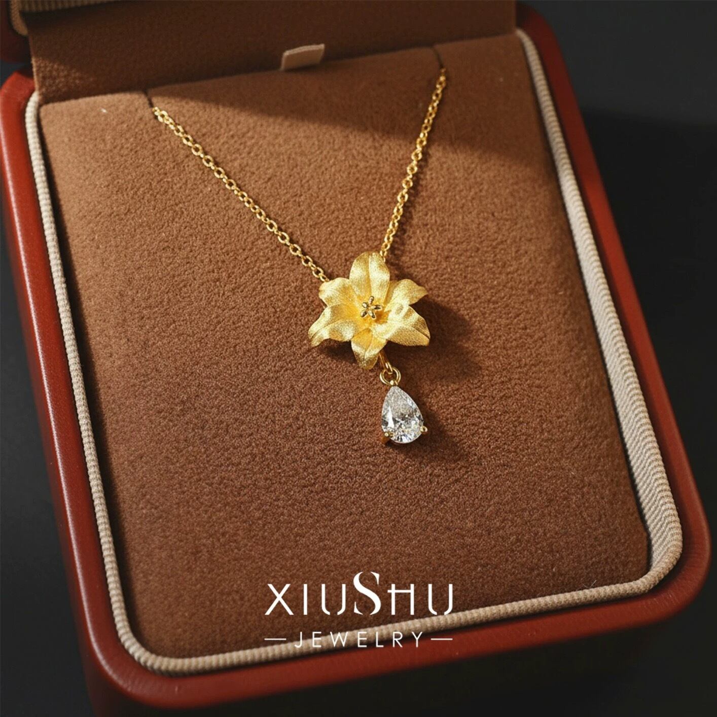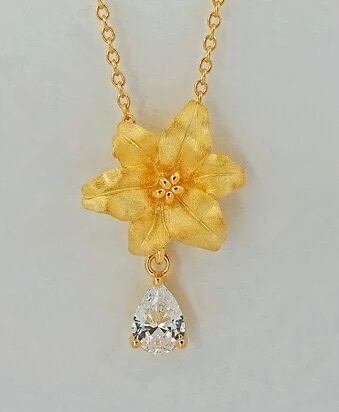 フラワー ユリの花 ヘアライン加工 高炭素ダイヤモンド キラキラ ゴージャス ネックレス ハイカーボンダイヤモンド S925 シルバー925 大人可愛い 大人かわいい 華やか 百合の花 レトロ サテン マット ゴールド