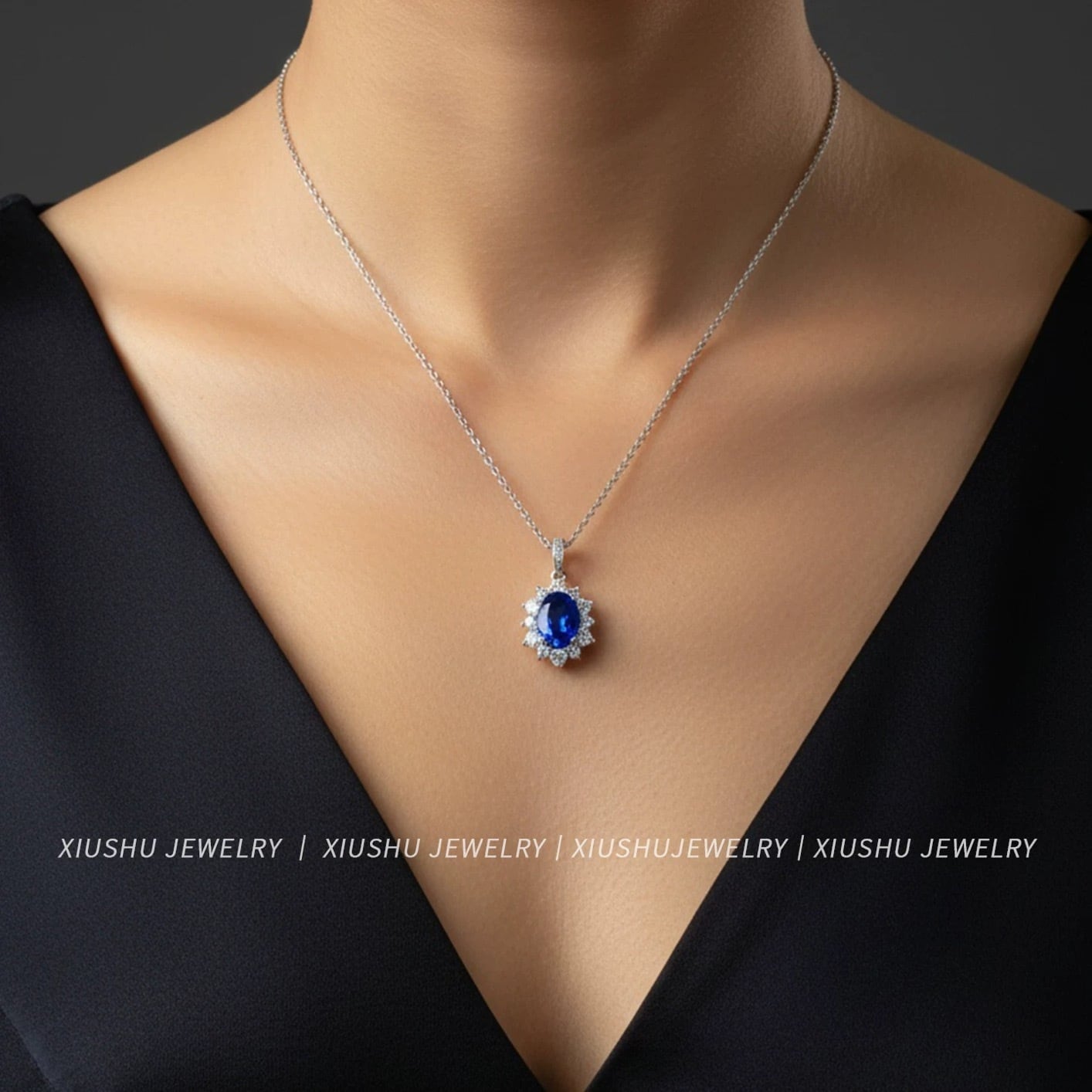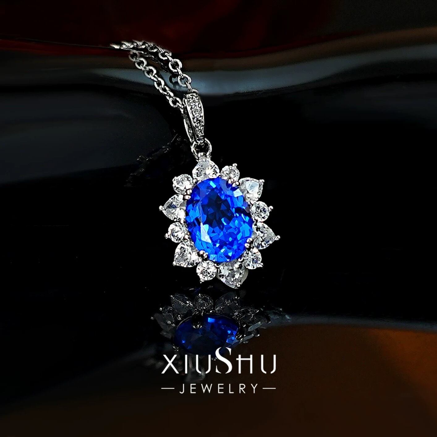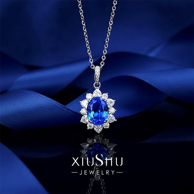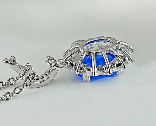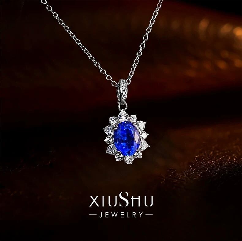 人工コーンフラワーサファイア オーバル 高炭素ダイヤモンド キラキラ ゴージャス ネックレス ハイカーボンダイヤモンド シルバー925 ブルー 青 レトロ