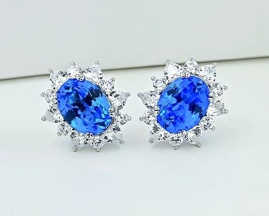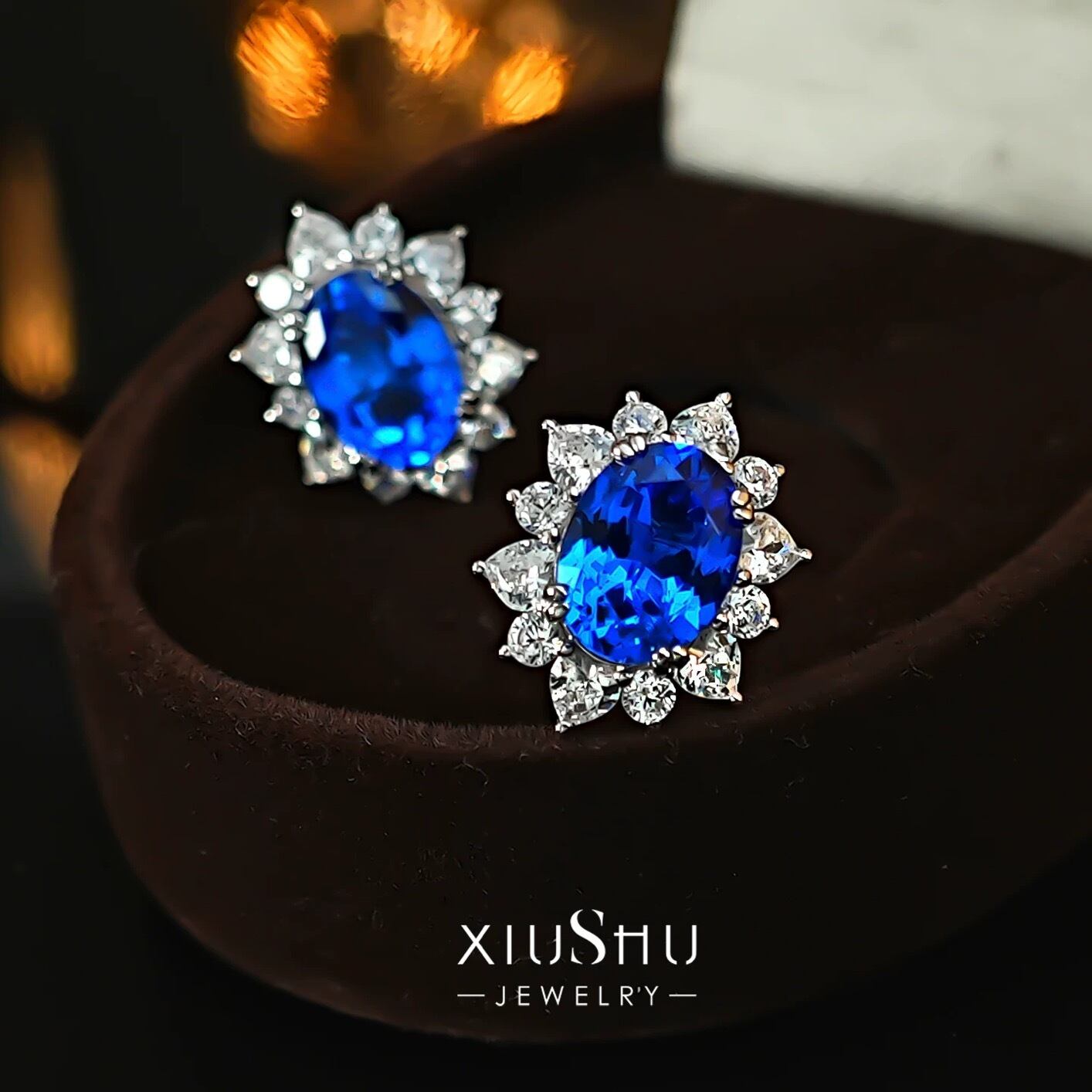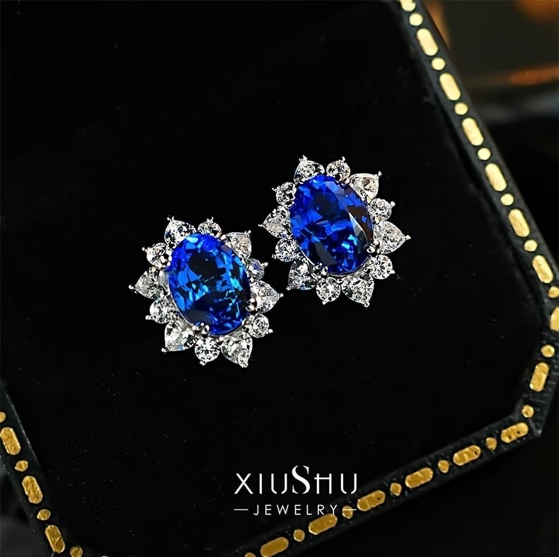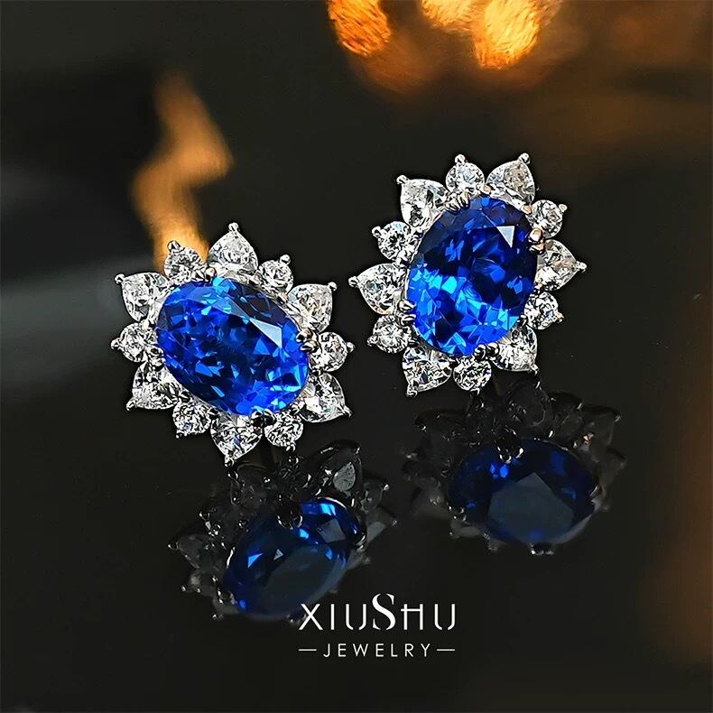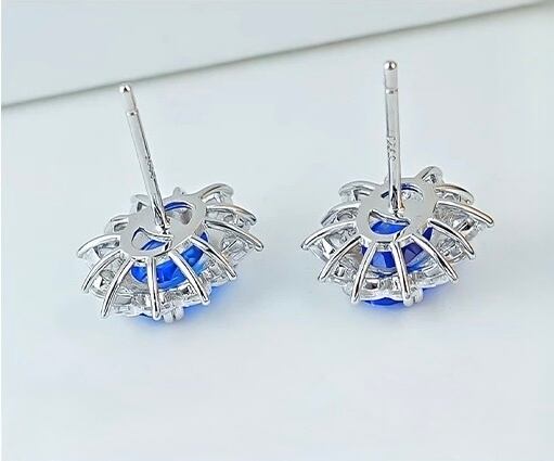 人工コーンフラワーサファイア オーバル 高炭素ダイヤモンド キラキラ ゴージャス スタッドピアス ハイカーボンダイヤモンド シルバー925 ブルー 青 レトロ