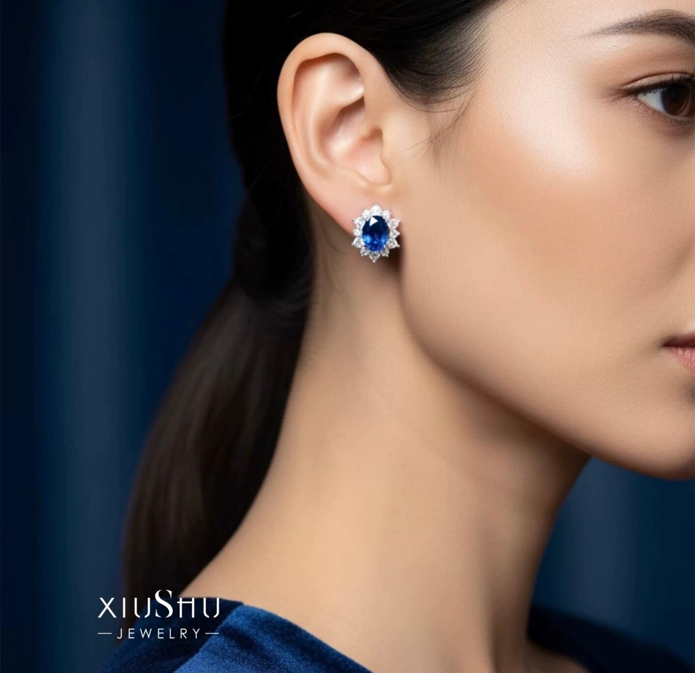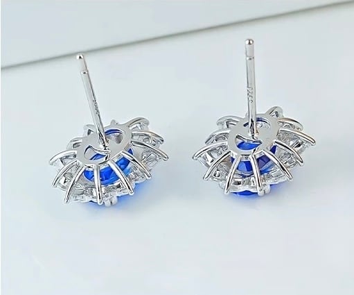 オリジナルの人工コーンフラワーサファイアと高炭素ダイヤモンドのピアスになります。