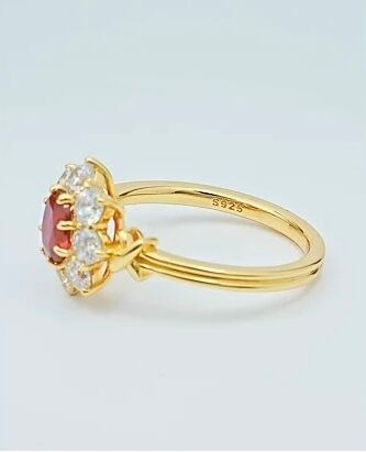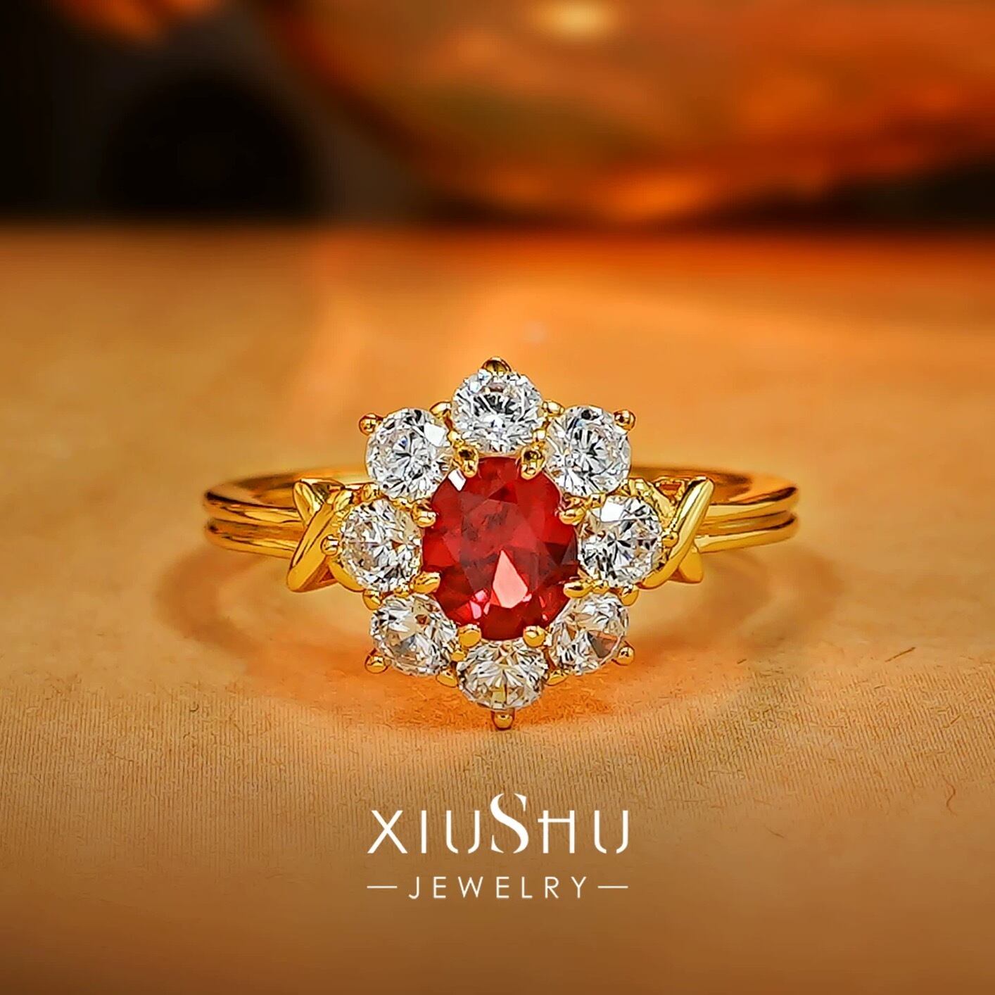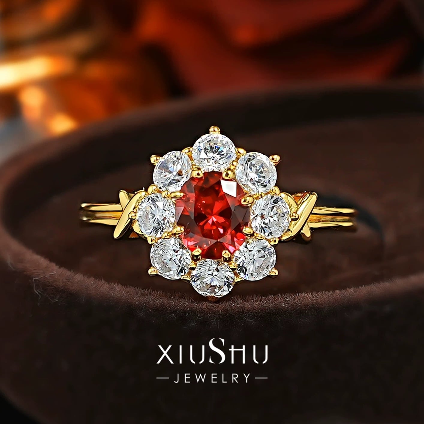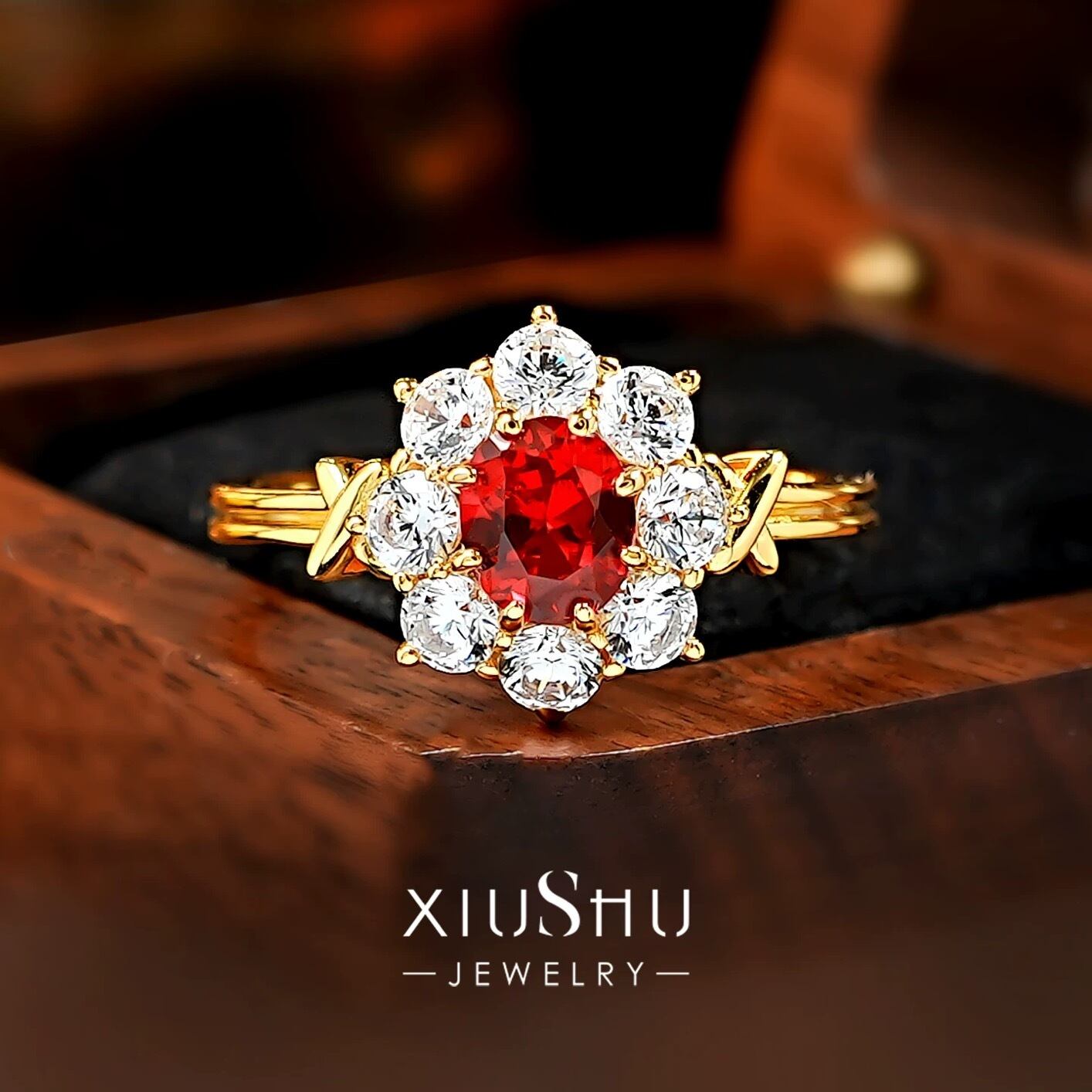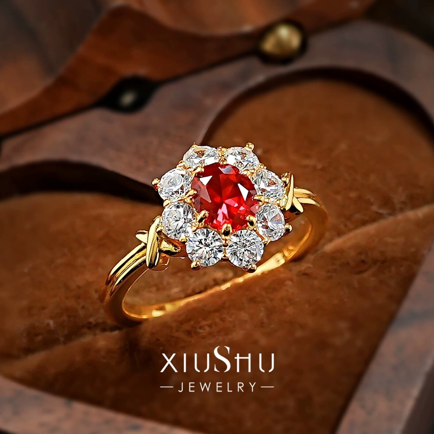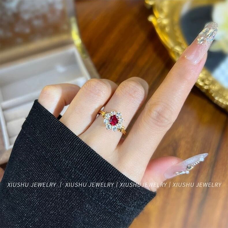 人工ピジョンブラッド ルビー フラワー 高炭素ダイヤモンド キラキラ ゴージャス 指輪 ハイカーボンダイヤモンド S925 シルバー925 リング レトロ クール レッド 赤 花