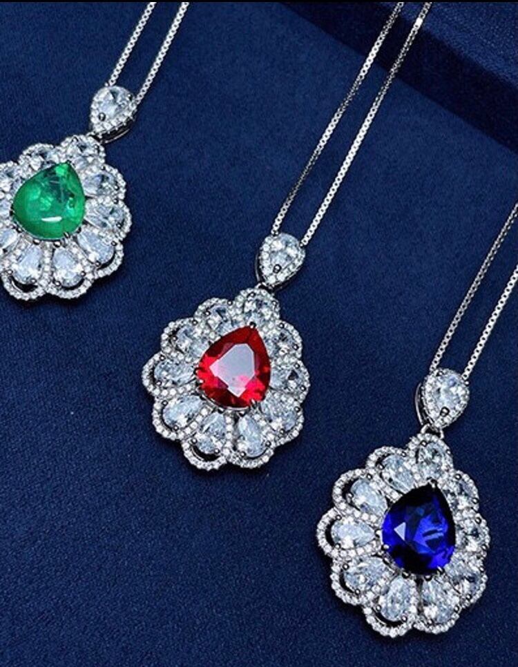 オリジナルの人工ルビーと高炭素ダイヤモンドのドロップフラワーネックレスになります。