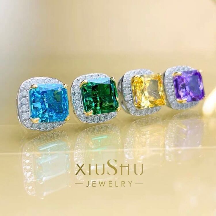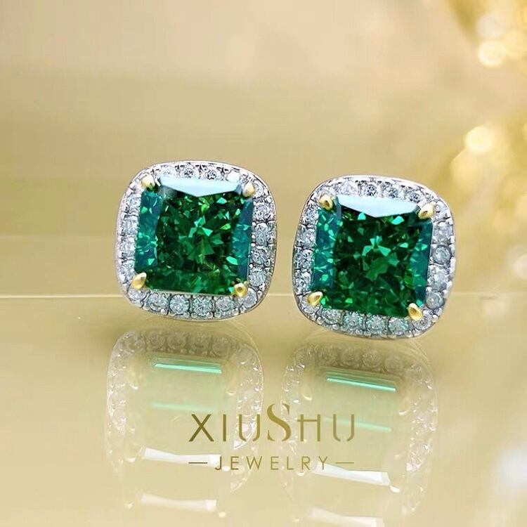 オリジナルの高炭素ダイヤモンドの人工エメラルドのヘイローピアスになります。