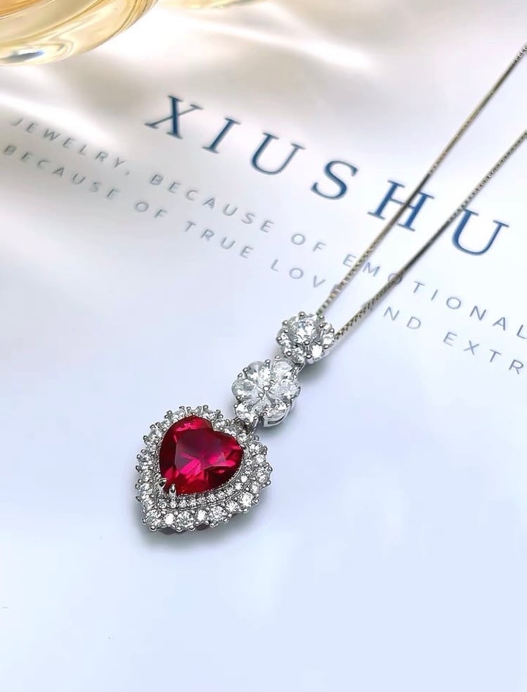 オリジナルの人工ルビーと高炭素ダイヤモンドのハートフラワーネックレスになります。