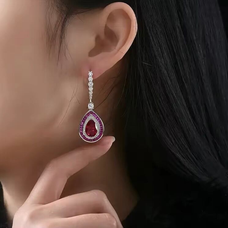 オリジナルの人工ルビーと高炭素ダイヤモンドのドロップピアスになります。