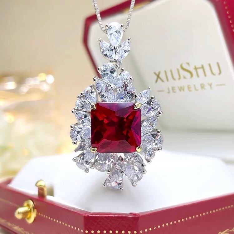 オリジナルの人工ルビーと高炭素ダイヤモンドのフラワーネックレスになります。