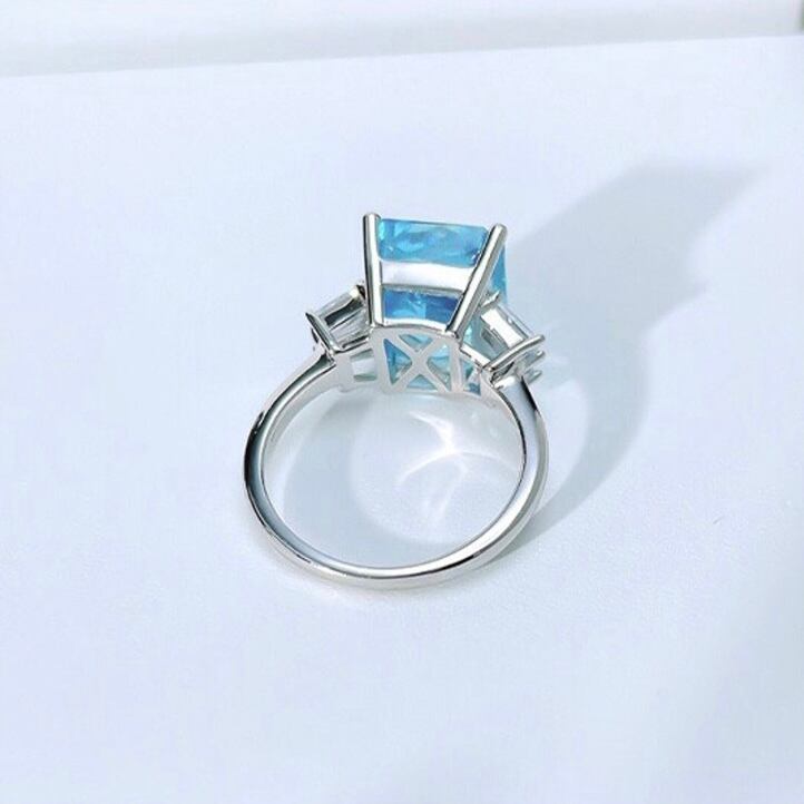 オリジナルの高炭素ダイヤモンドの人工アクアマリンのラディアントカットのリングになります。