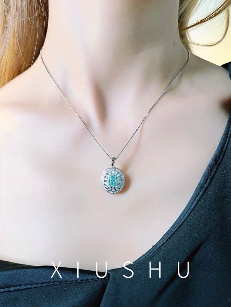 オリジナルの高炭素ダイヤモンドの人工パライバトルマリンのネックレスになります。