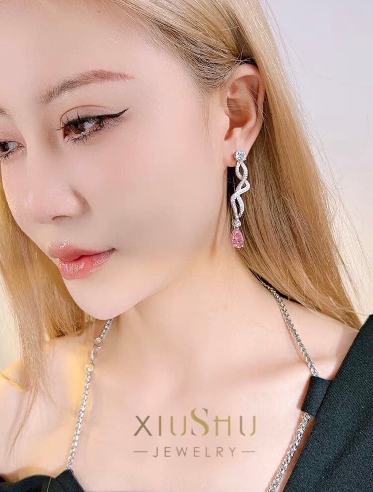 クロス ドロップ ロングピアス 高炭素ダイヤモンド キラキラ ラグジュアリー ゴージャス ピンク ラウンド ホワイト 白