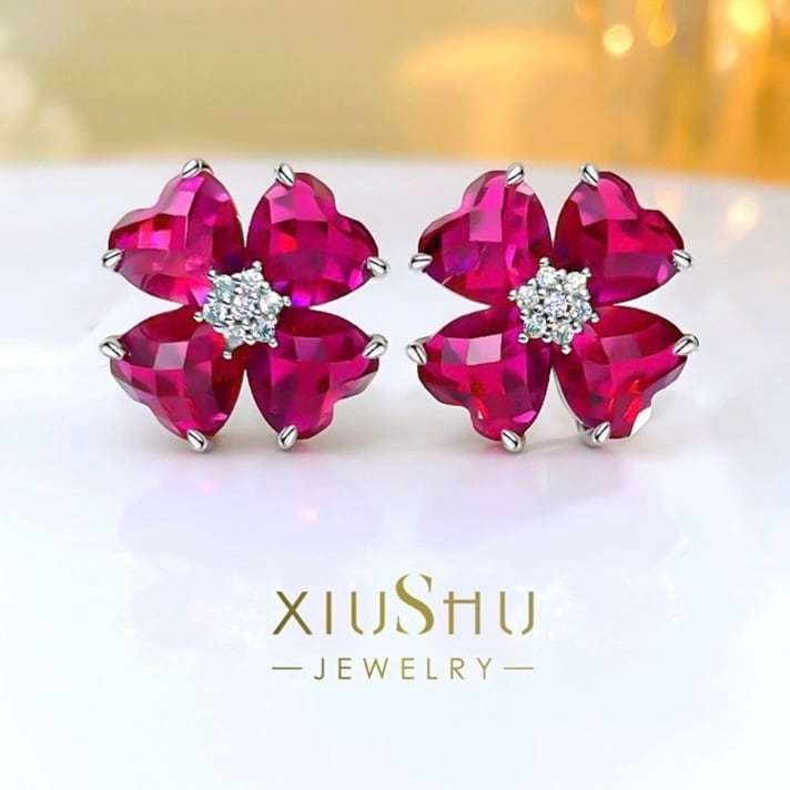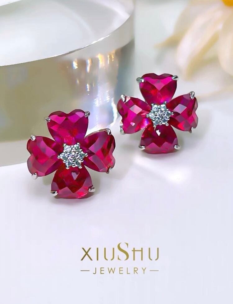 オリジナルの高炭素ダイヤモンドの人工ルビーの四つ葉のクローバーデザインのスタッドピアスになります。
