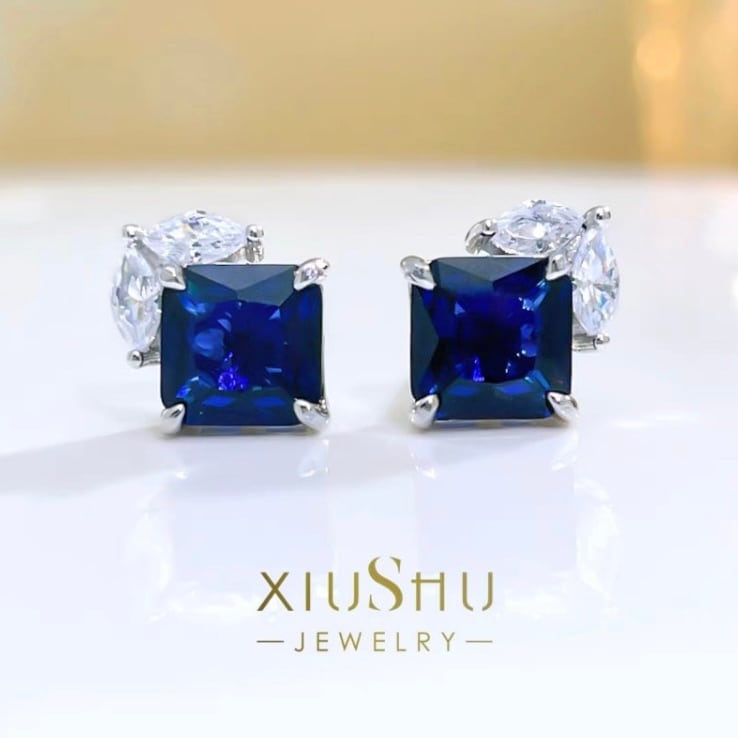 オリジナルの人工サファイアと高炭素ダイヤモンドのスタッドピアスになります。