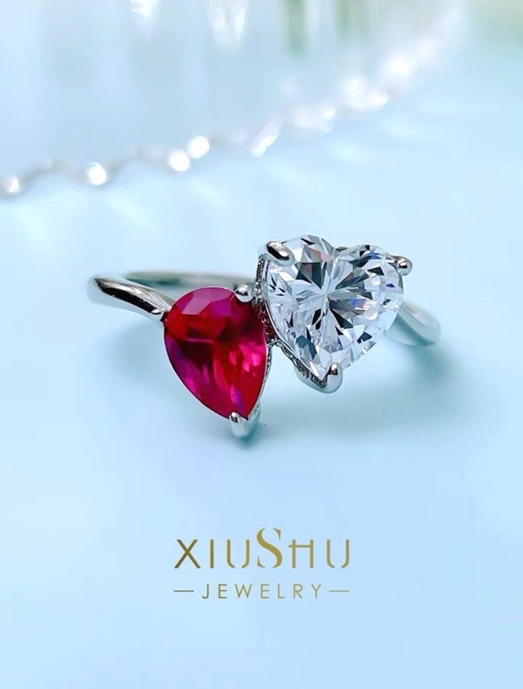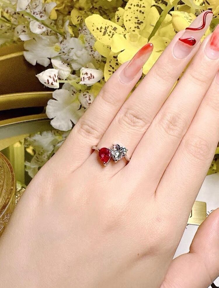 オリジナルの高炭素ダイヤモンドの人工ルビーとハートダブルストーンリングになります。