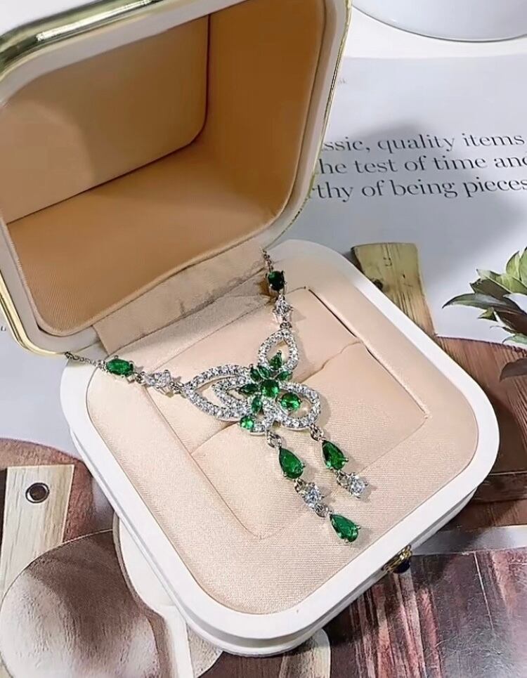 オリジナルの高炭素ダイヤモンドの人工エメラルドバタフライネックレスになります。