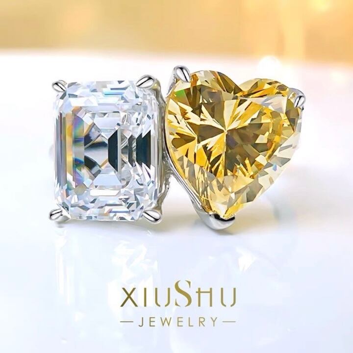 オリジナルの高炭素ダイヤモンドのハートと長方形のダブルストーンリングになります。