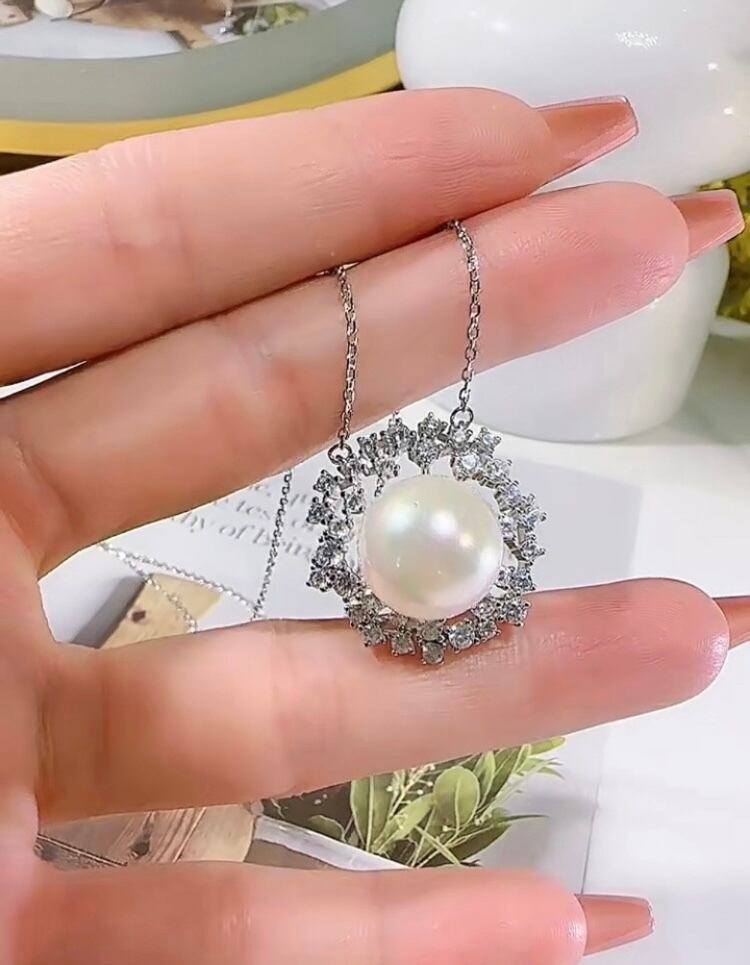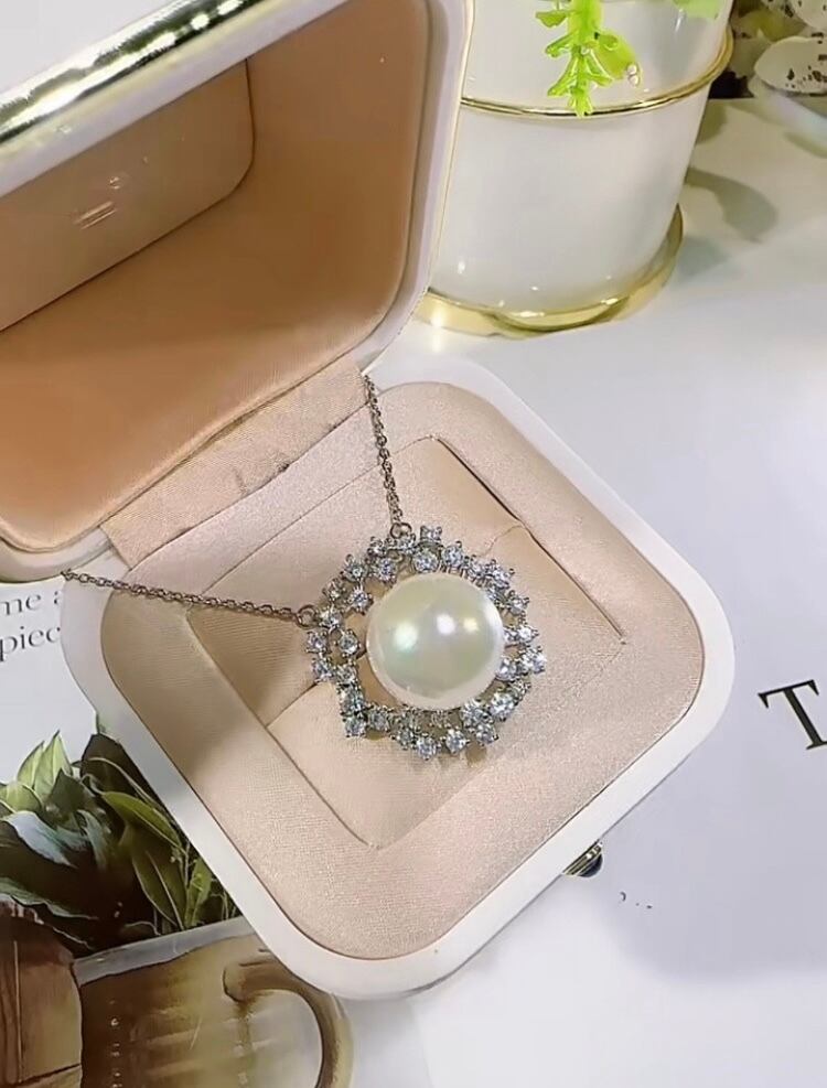 オリジナルの人工マザーオブパールと高炭素ダイヤモンドのネックレスになります。