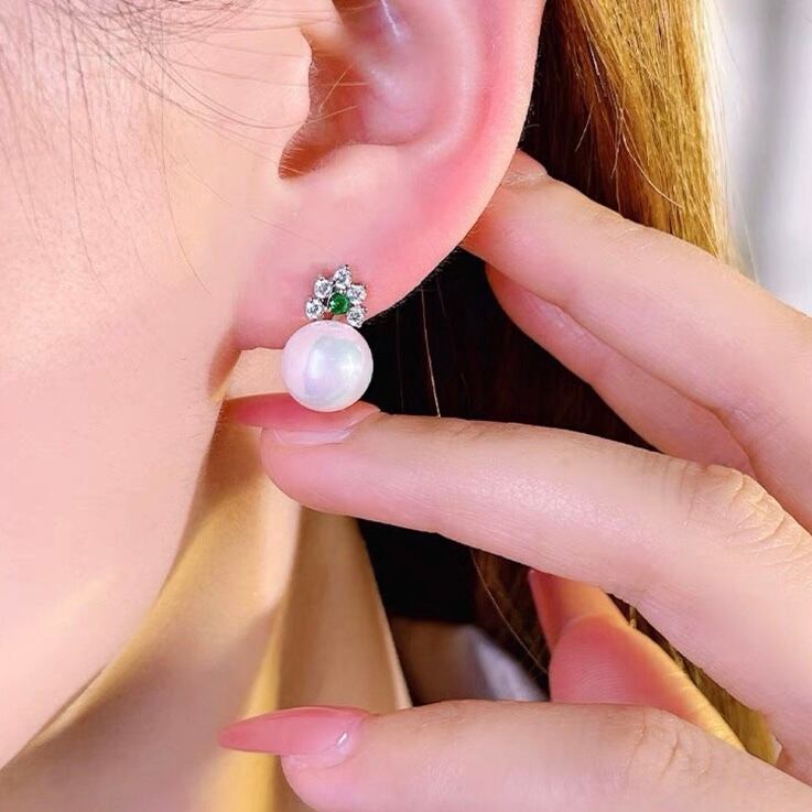 オリジナルの人工マザーオブパールと高炭素ダイヤモンドの人工エメラルドスタッドピアスになります。