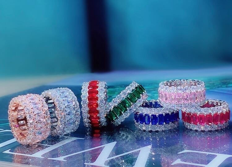 オリジナルの人工ルビーと高炭素ダイヤモンドのエタニティリングになります。