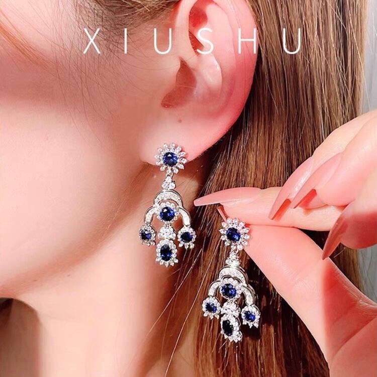 オリジナルの人工サファイアと高炭素ダイヤモンドのシャンデリアスタッドピアスになります。