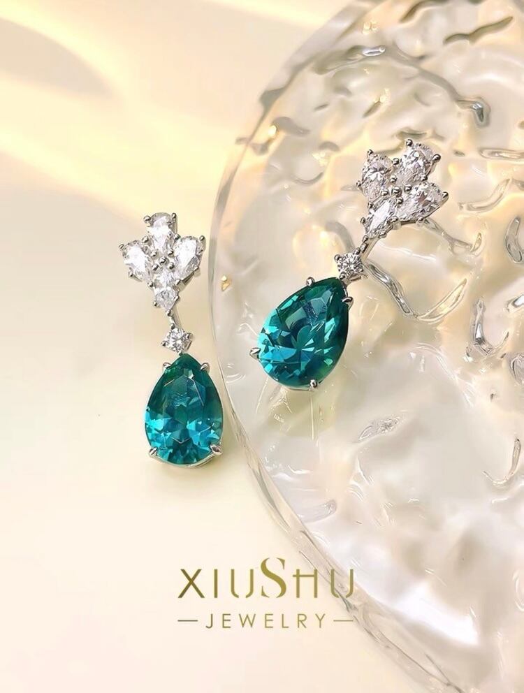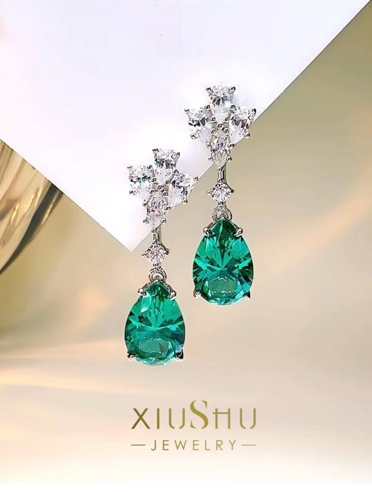 オリジナルの炭素ダイヤモンドの人工エメラルドのドロップピアスになります。