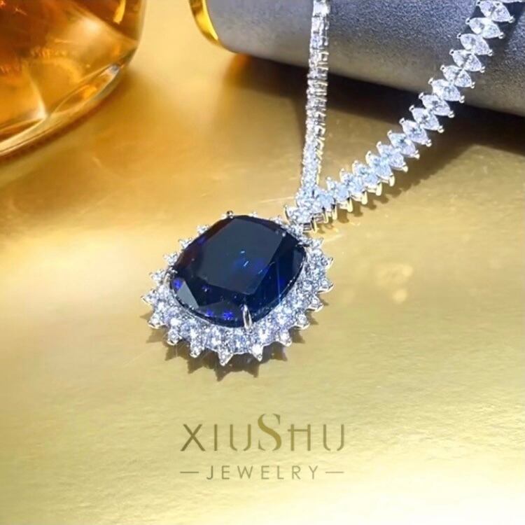 オリジナルの人工ロイヤルブルーサファイアと高炭素ダイヤモンドのネックレスになります。