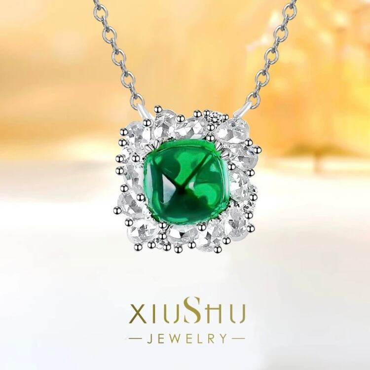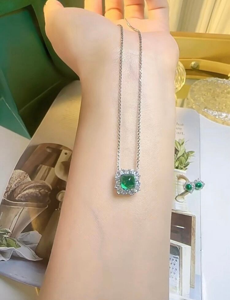オリジナルの人工エメラルドと高炭素ダイヤモンドのネックレスになります。
