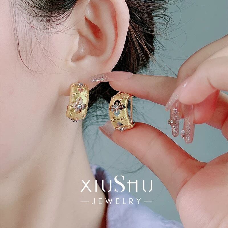 織物 ブラッシュ 四葉のクローバー 高炭素ダイヤモンド キラキラ ゴージャス レトロ ゴールド シルバー スタッドピアス フープピアス レース 四つ葉 ゴールド | キラキラゴージャスジュエリーのXIUSHU(シュシュ)