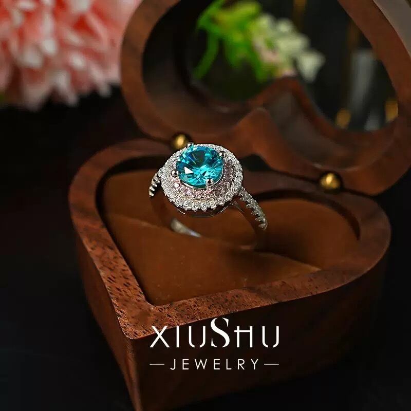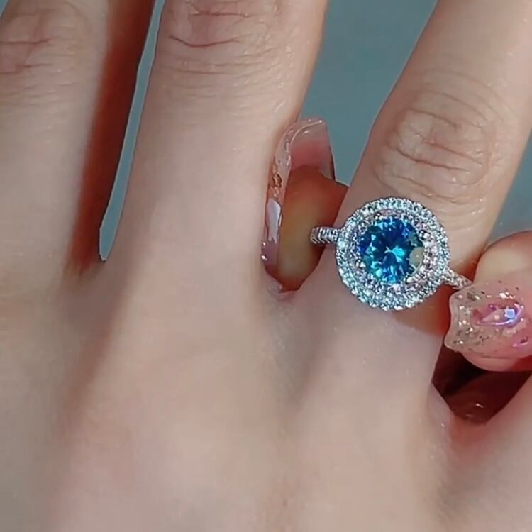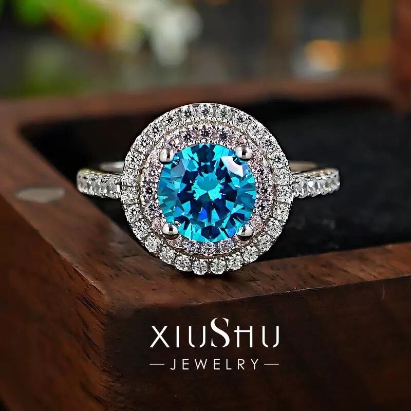 人工ブルートパーズ×ピンク×ホワイト 高炭素ダイヤモンド キラキラ ゴージャス ダブルヘイローリング ラウンド 指輪 ハイカーボンダイヤモンド 青 | キラキラゴージャスジュエリーのXIUSHU(シュシュ)