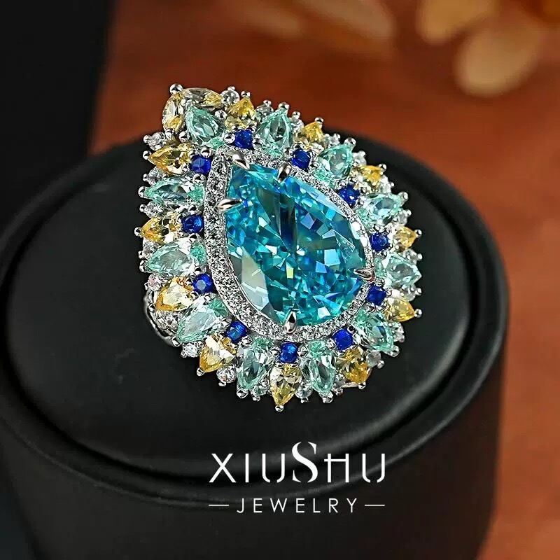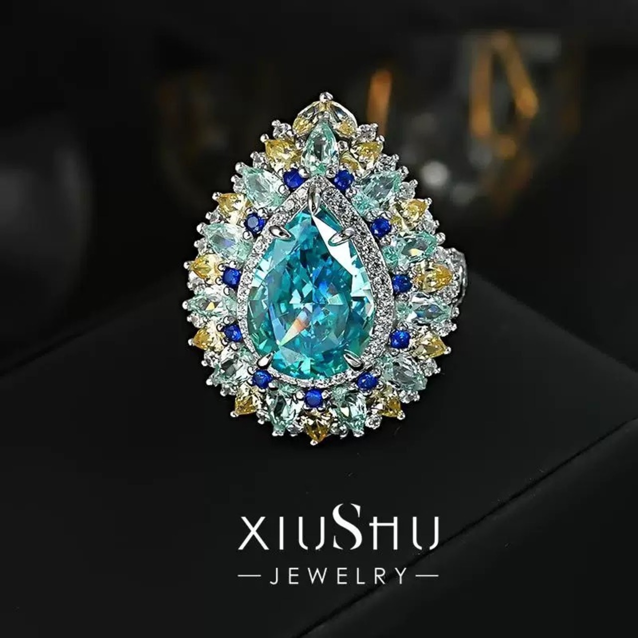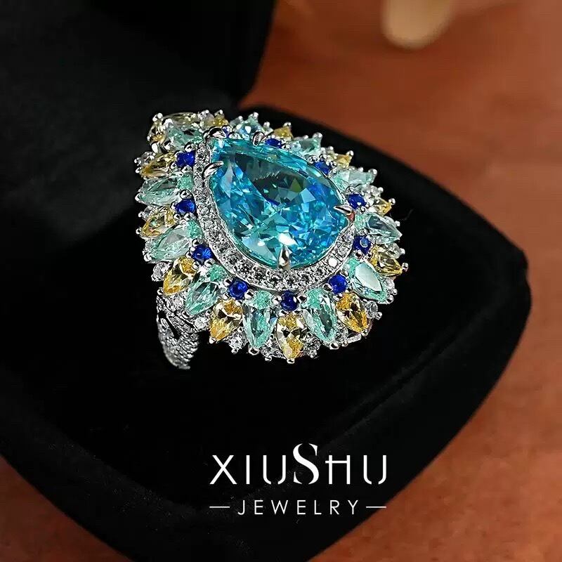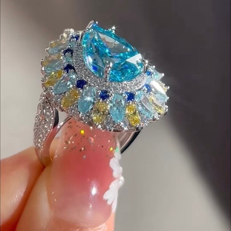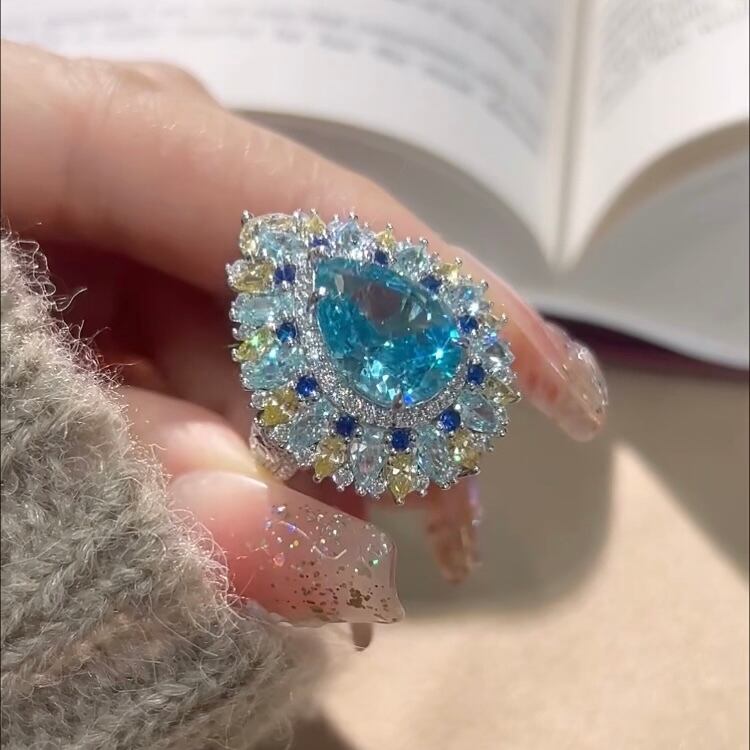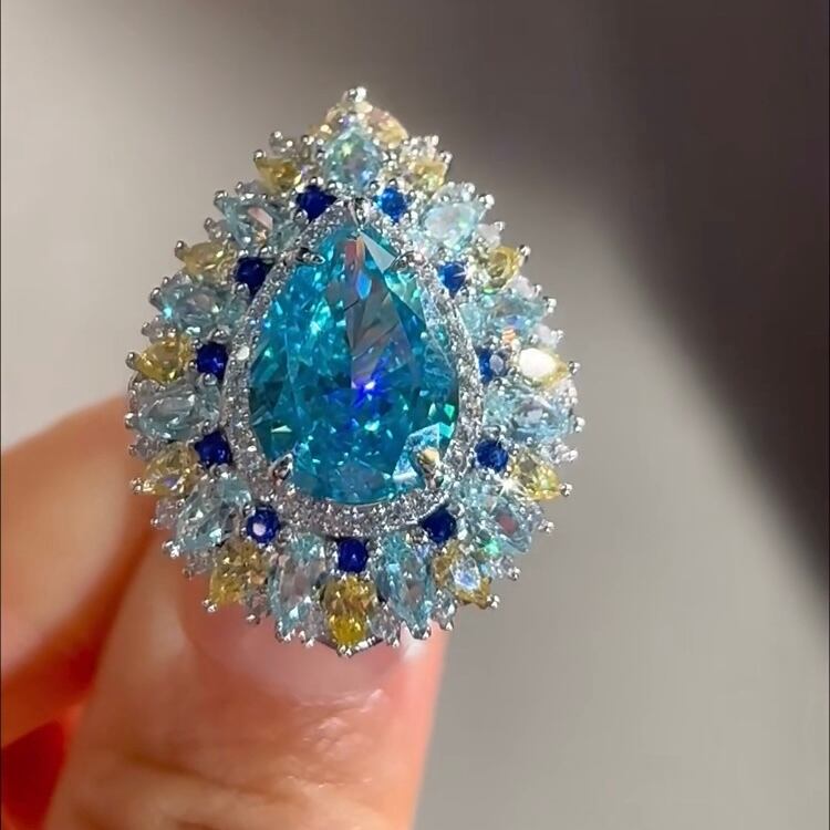 人工パライバトルマリン ペアシェイプ 高炭素ダイヤモンド キラキラ ラグジュアリー ゴージャス ヘイローリング ラウンド 指輪 ハイカーボンダイヤモンド 青 カラフル ブルー 黄色 イエロー ドロップ ビッグ