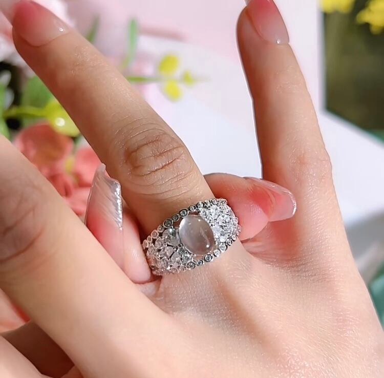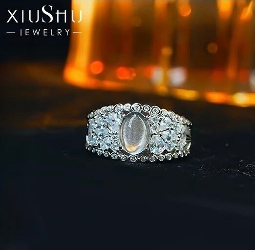 人工白翡翠 オーバル 高炭素ダイヤモンド キラキラ ゴージャス レトロ ヘイローリング ホワイトジェイド フラワー 花 ワイドリング 指輪 ハイカーボンダイヤモンド | キラキラゴージャスジュエリーのXIUSHU(シュシュ)