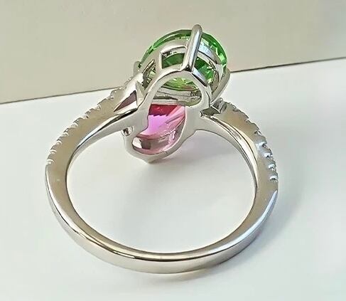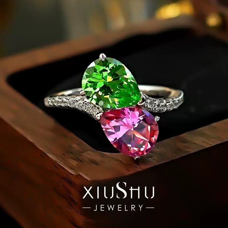 人工ピンクトルマリン グリーントルマリン 高炭素ダイヤモンド キラキラ ゴージャス リング 指輪 ハイカーボンダイヤモンド ホワイト グリーン 緑 ダブルストーン ペアシェイプ ドロップ シルバー925 | キラキラゴージャスジュエリーのXIUSHU(シュシュ)