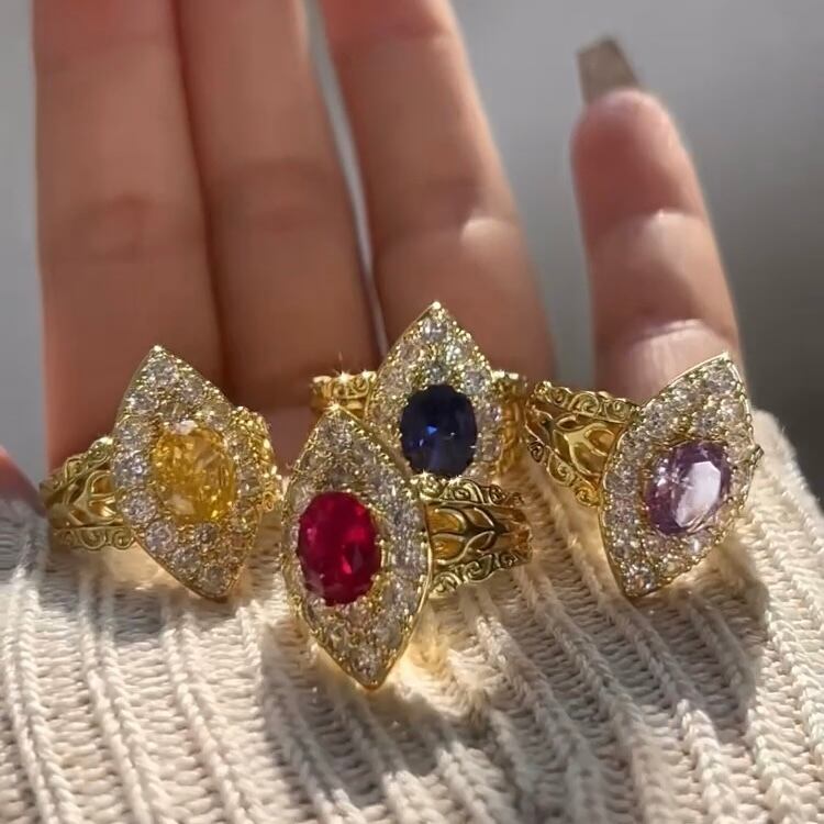 マーキス イエロー ゴージャス ラグジュアリー ヘイローリング レトロ 人工ダイヤモンド 黄色 大きめ ビッグ 指輪 彫刻 ワイドリング フリーサイズ 調整可能 | キラキラゴージャスジュエリーのXIUSHU(シュシュ)