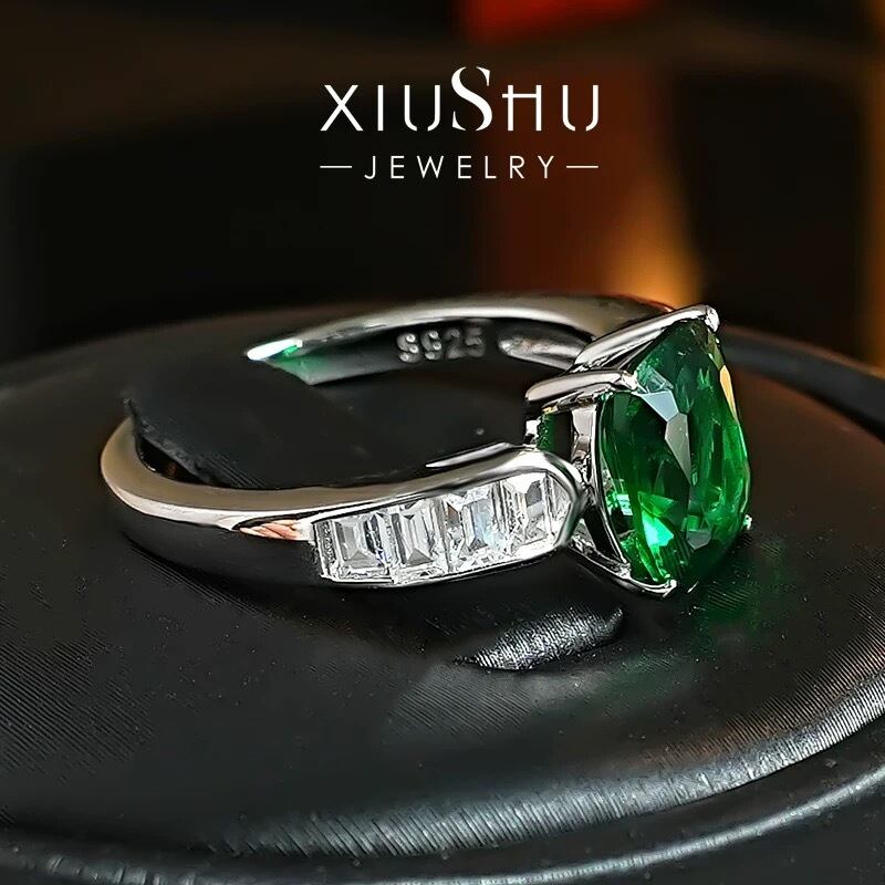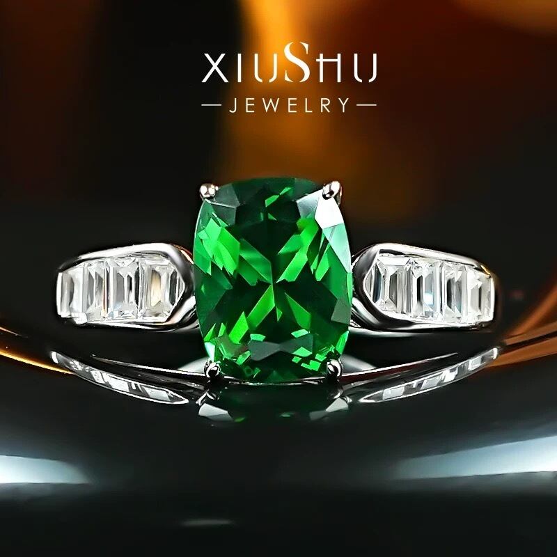 3カラット 人工グリーントルマリン 高炭素ダイヤモンド キラキラ ゴージャス 緑 指輪 ハイカーボンダイヤモンド グリーン リング レトロ 長方形 エメラルドカラー オーバル | キラキラゴージャスジュエリーのXIUSHU(シュシュ)