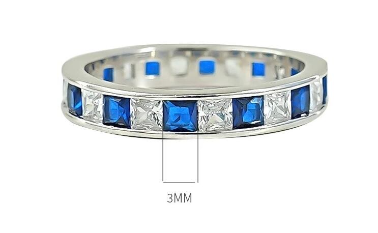 スクエア 人工ロイヤルブルーサファイア 高炭素ダイヤモンド キラキラ ゴージャス フルエタニティリング ブルー 青 指輪 ハイカーボンダイヤモンド 小さめ ベゼルリング