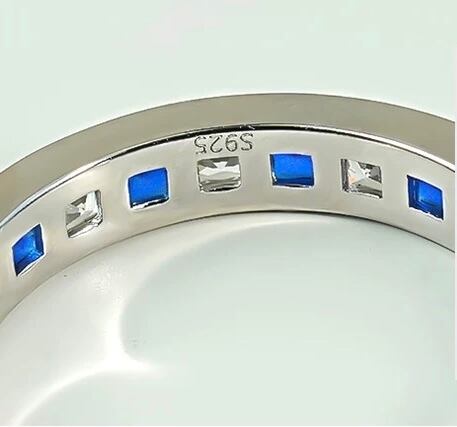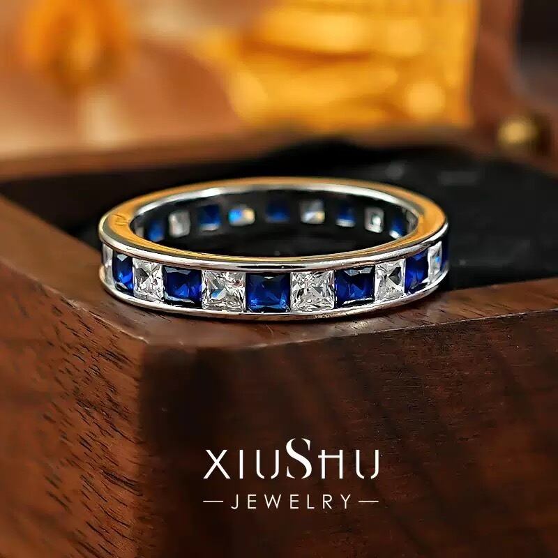 スクエア 人工ロイヤルブルーサファイア 高炭素ダイヤモンド キラキラ ゴージャス フルエタニティリング ブルー 青 指輪 ハイカーボンダイヤモンド 小さめ ベゼルリング | キラキラゴージャスジュエリーのXIUSHU(シュシュ)
