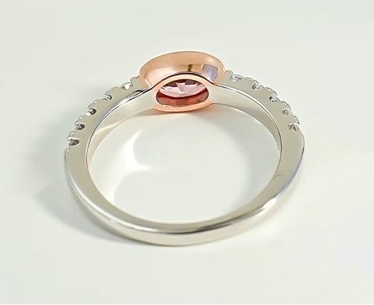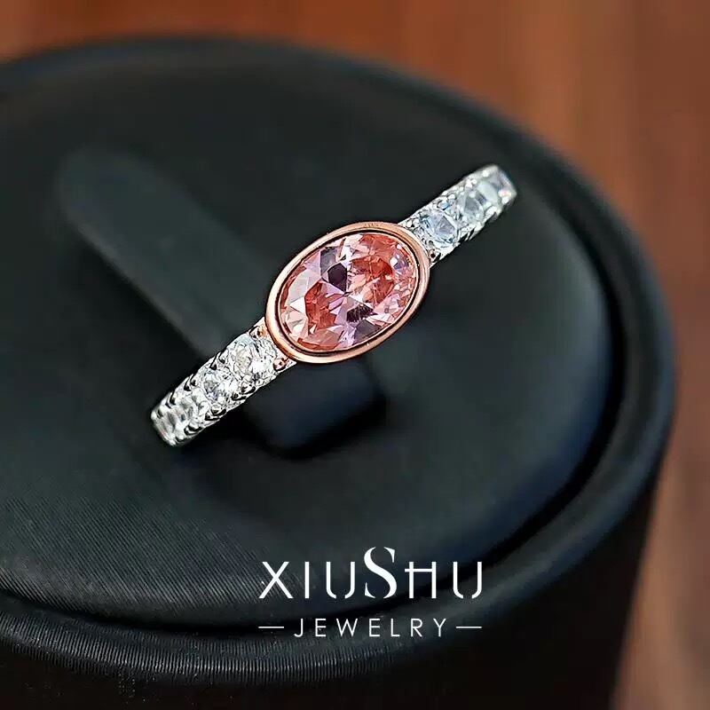 人工パパラチアサファイア オーバル 高炭素ダイヤモンド キラキラ ゴージャス ピンク オレンジ 指輪 ハイカーボンダイヤモンド 小さめ ベゼルリング メレ | キラキラゴージャスジュエリーのXIUSHU(シュシュ)