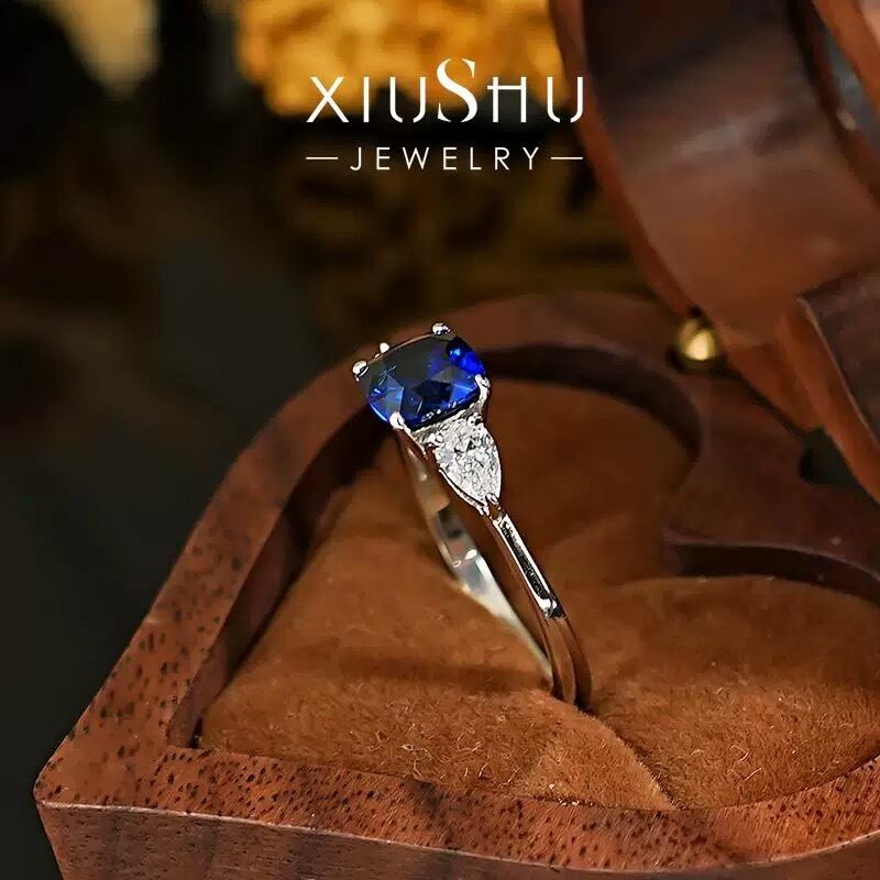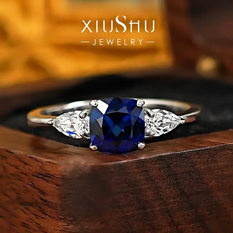 人工サファイア 3石 高炭素ダイヤモンド キラキラ ゴージャス ブルー 青 指輪 ハイカーボンダイヤモンド リング 小さめ ミニ シンプル 角丸スクエア | キラキラゴージャスジュエリーのXIUSHU(シュシュ)