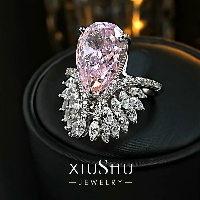 天津の翼 ペアシェイプ ライトピンク 高炭素ダイヤモンド キラキラ ゴージャス ドロップリング 指輪 ウィング ウィング クラウン 王冠 大きい ビッグ ラージ 大きめ ハイカーボンダイヤモンド シルバー925