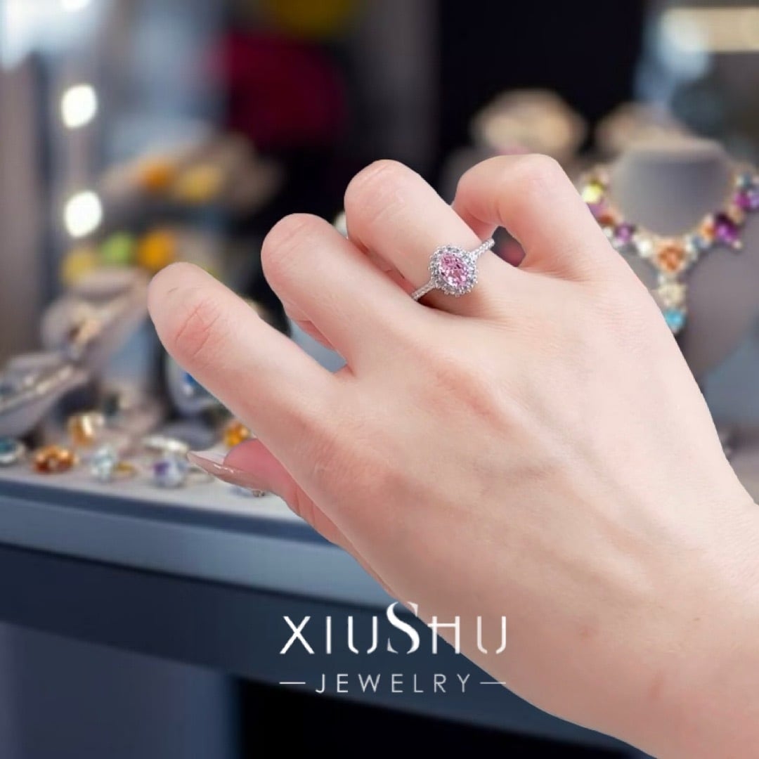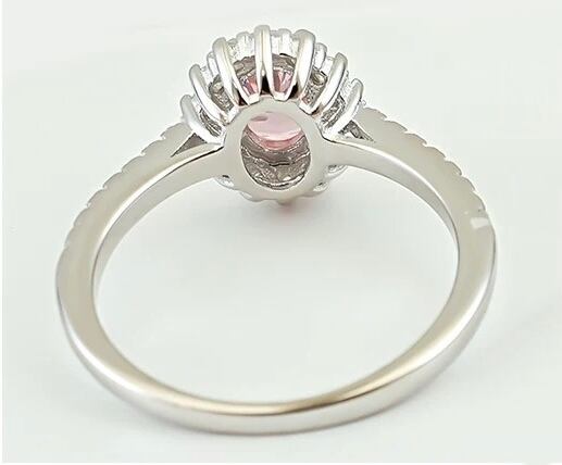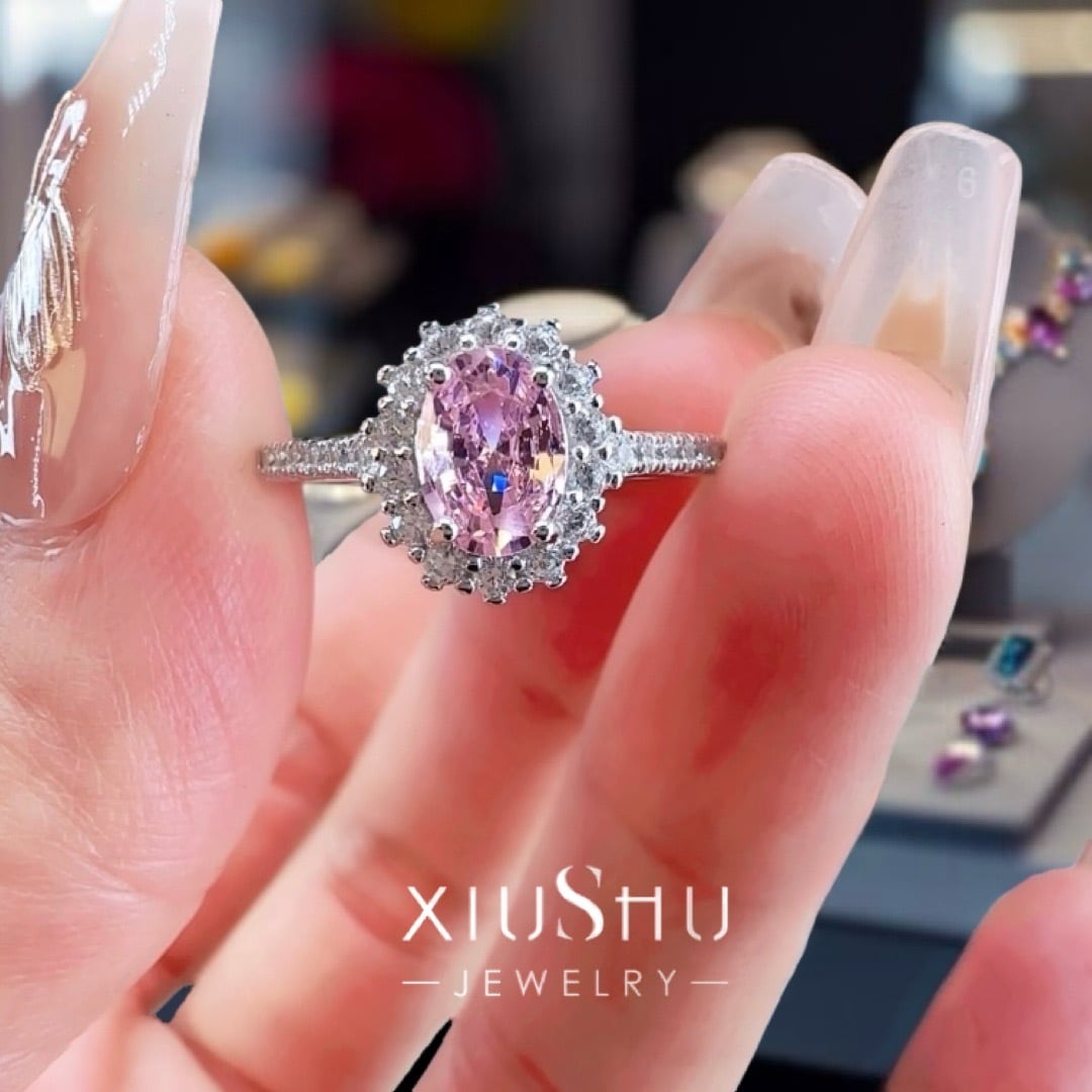 人工パパラチアサファイア オーバル 高炭素ダイヤモンド キラキラ ゴージャス ピンク 指輪 ハイカーボンダイヤモンド 小さめ ヘイローリング メレタイプ ミニ | キラキラゴージャスジュエリーのXIUSHU(シュシュ)
