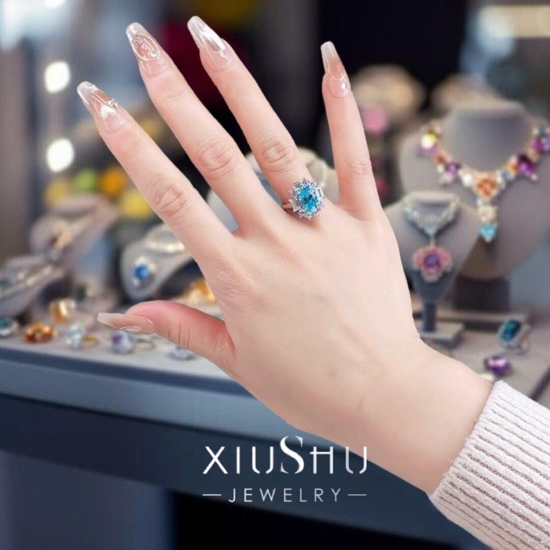 人工ブルートパーズ オーバル フラワー 高炭素ダイヤモンド キラキラ ゴージャス ヘイローリング 指輪 ハイカーボンダイヤモンド 青 モダン 海 シルバー925 花 | キラキラゴージャスジュエリーのXIUSHU(シュシュ)